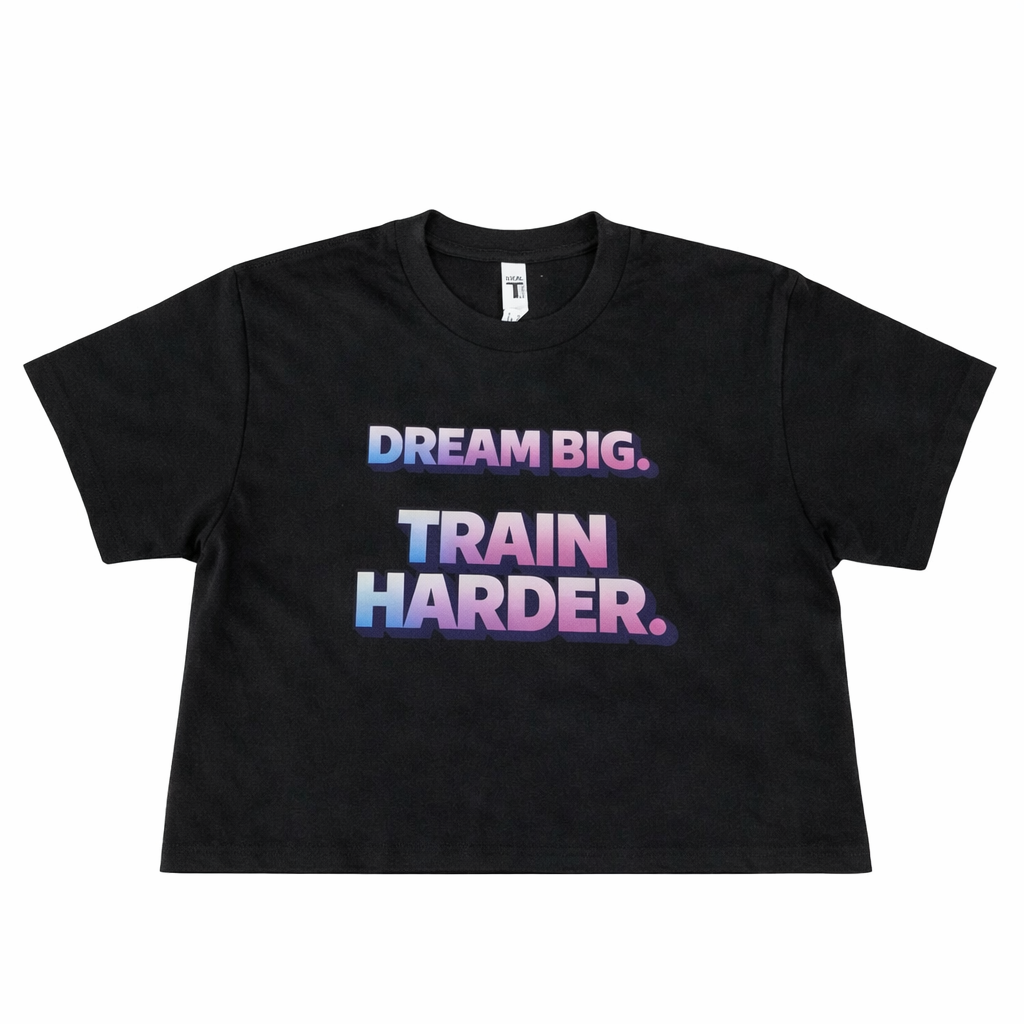 Finished with a set-in 1x1 baby rib collar and cuffs, this crop top balances durability with a clean, elevated look. The bold Dream Big Train Hard graphic represents discipline, growth, and a mindset built for progress.